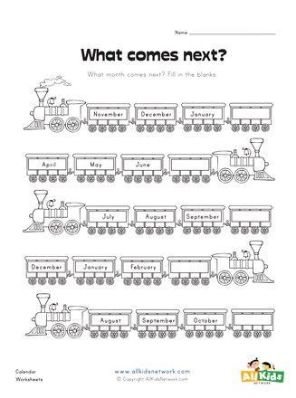 This is the perfect worksheet for kids to practice the order of the months of the year. Each row shows a train with months on each car, but one is missing at the end. Children need to know the order of the months in order to fill in the blank car.