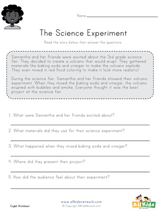 This reading comprehension worksheet invites students to dive into the exciting world of Samantha and her friends as they prepare a volcano experiment for their 3rd grade science fair. Using common materials like baking soda and vinegar, they create an erupting volcano, capturing everyone's attention at the fair. The worksheet provides questions to help students understand the steps involved in conducting a simple science experiment and the scientific concepts behind it, perfect for classroom or home learning.